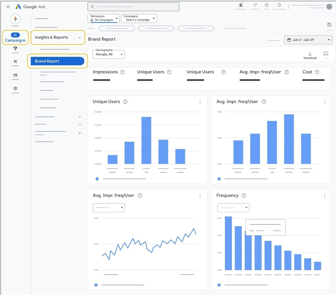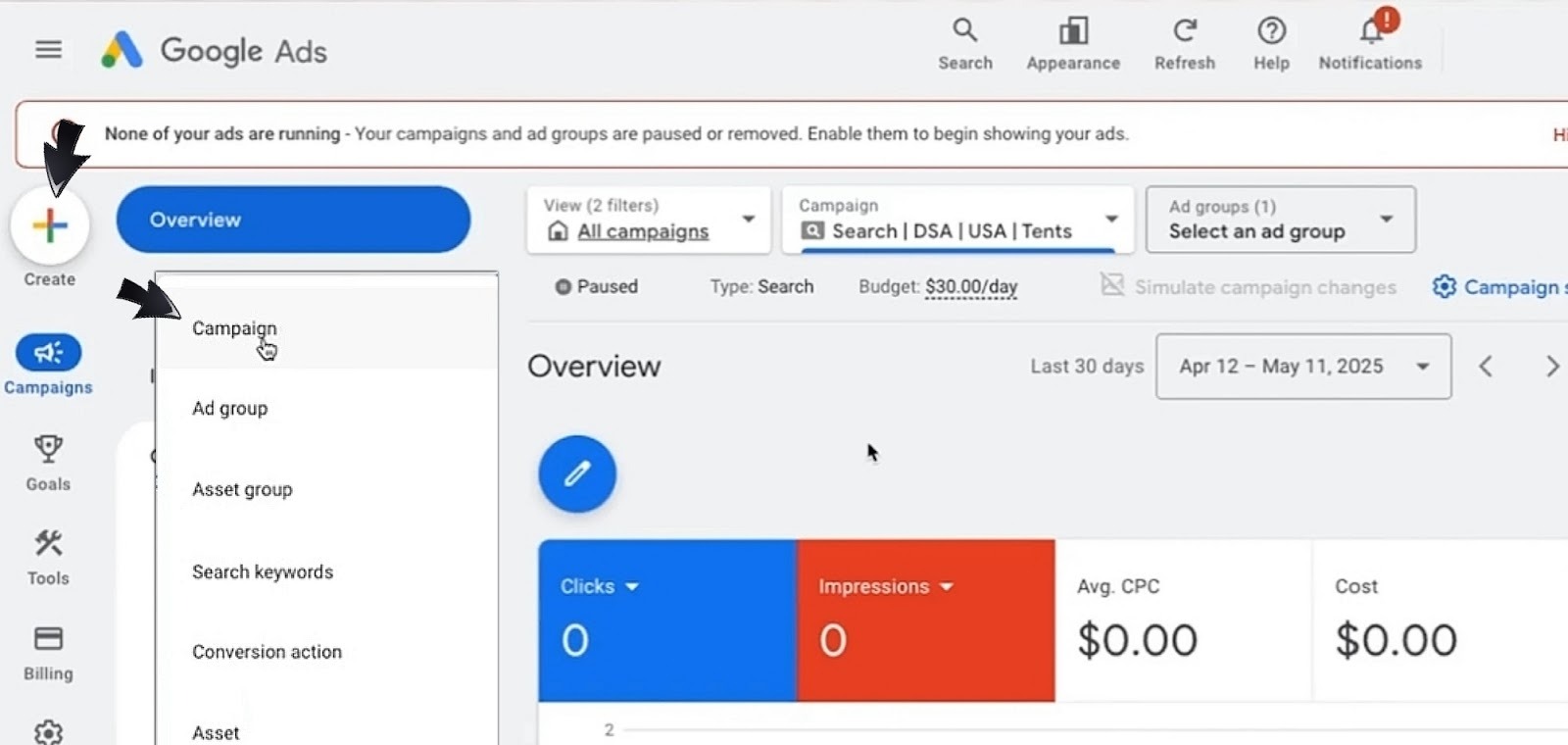 Start by creating a campaign: In Google Ads, click on ‘Create’ and select ‘Campaign’.