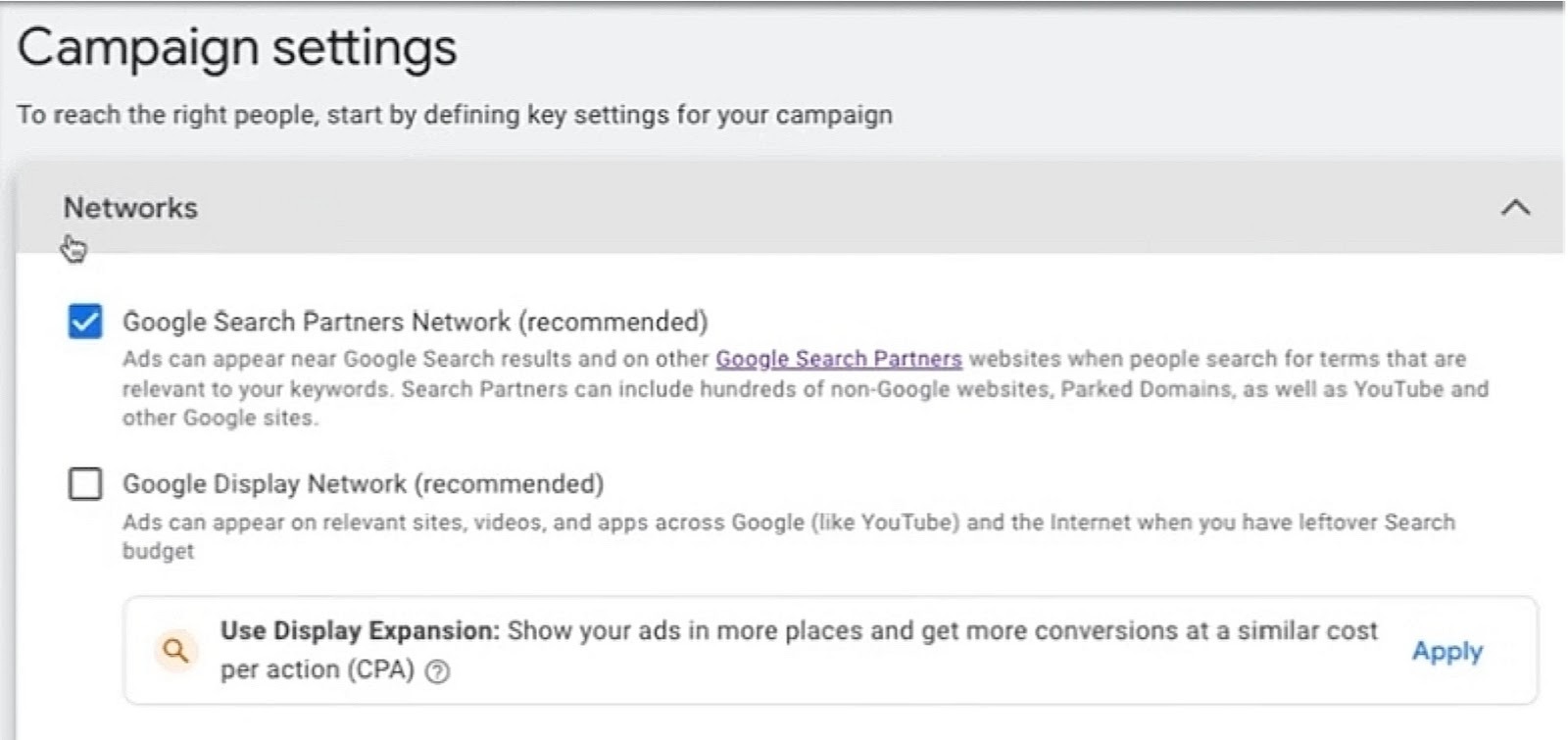 Networks: Dynamic Search Ads campaigns perform best when focused on Search intent and paired with clear location/language settings. So, you might want to uncheck ‘Display Network’ and enable ‘Search Network’ to maintain your search intent.