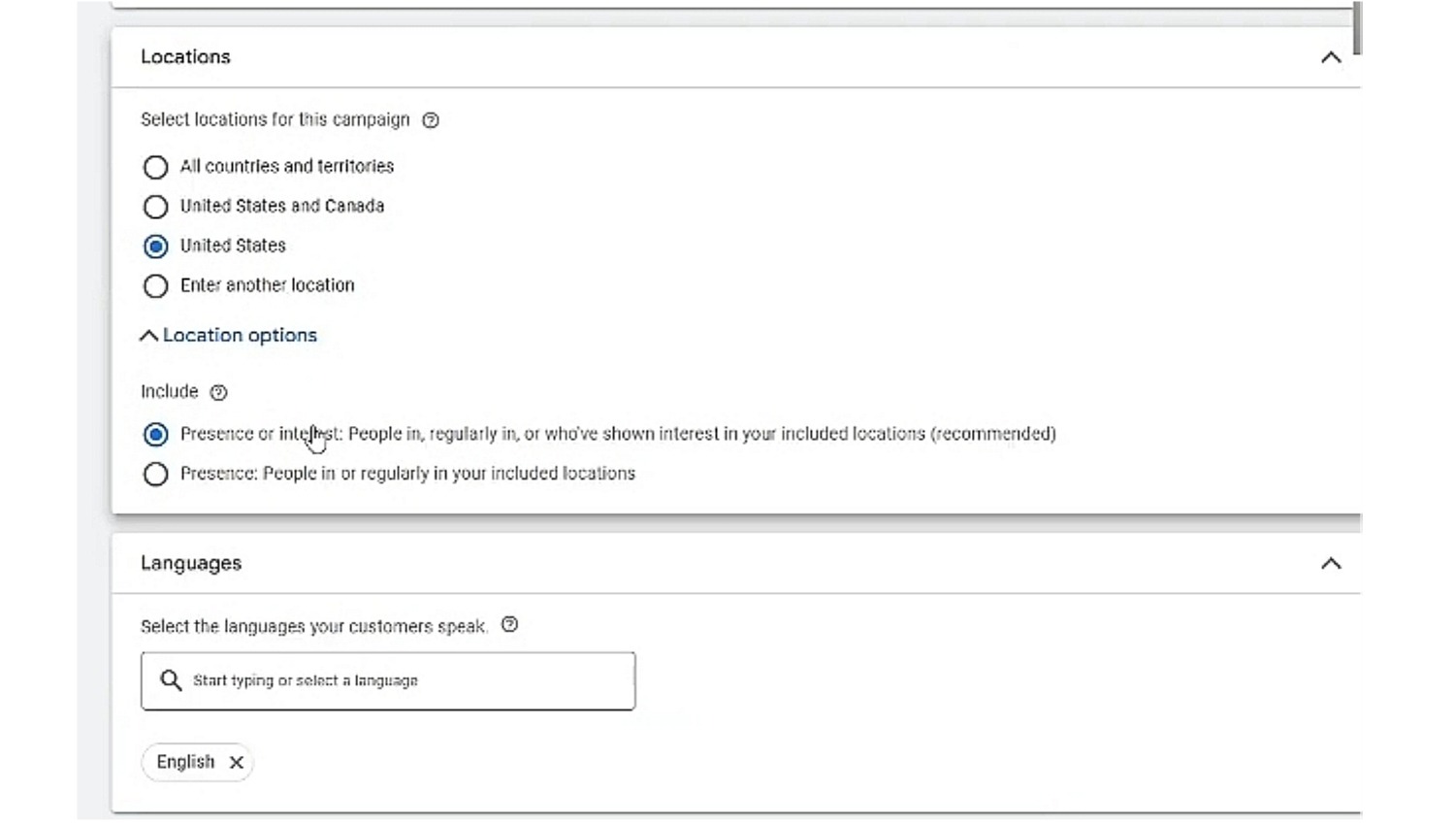 Locations and Language: Set geographic targeting to the markets you serve (e.g. United States or specific states/cities) and then choose the primary language of your landing pages to match. You don't want your ads to be displayed to Spanish-speaking audiences when your website is in English.