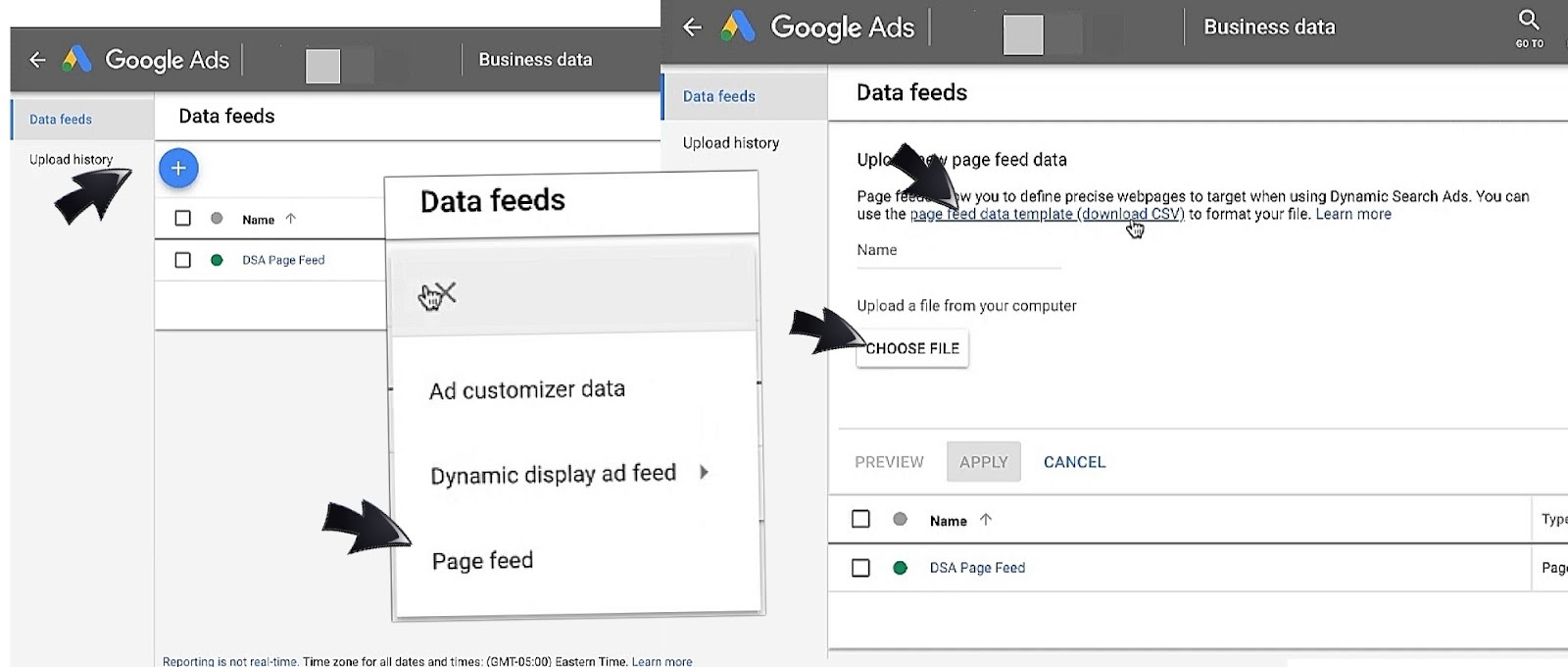 If you don’t have a page feed document yet, click on the ‘page feed data template’ to download it, input your data, save, and return to this business data page in Google Ads.