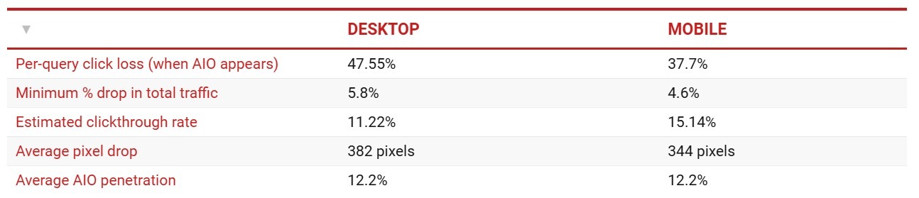 Authoritas found a 47.5% CTR drop on desktop when AI Overviews appear.