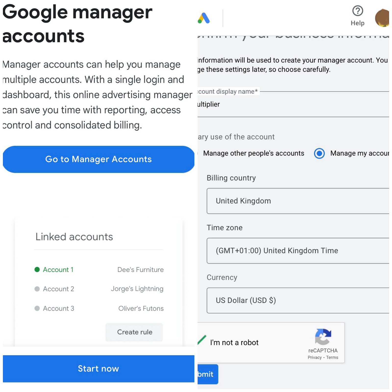 Organization or agency Google Ads account setup is easy. You can create Google Ads manager account in these simple steps: Click “Go to Manager Accounts” > Sign in with Google business e-mail > enter Account display name > Billing country > Timezone > Currency (regardless of client's account currency).
