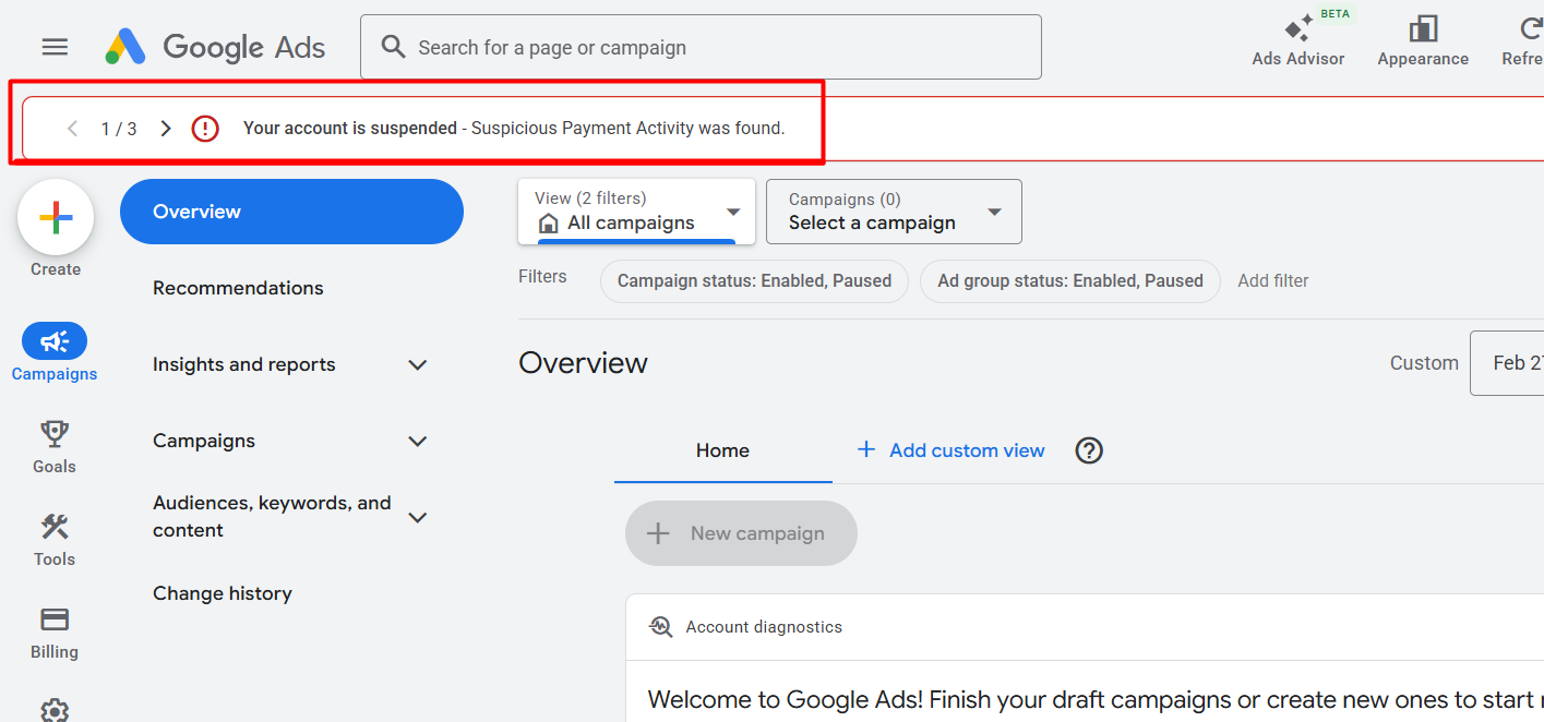 Another nail in the coffin of the "$1-5 warm-up" method is the reaction to scaling. Imagine the warm-up went well. The buyer switches to the target campaign and sets a $100-$200 budget. Even with the same IP address, the system might view this as an account hack or fraud. Yesterday, the advertiser spent pennies on cat videos, and today they suddenly decided to spend hundreds of dollars a day while testing suspicious keywords. An automatic security trigger fires, and the account is frozen or banned for "Circumventing Systems."